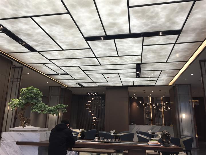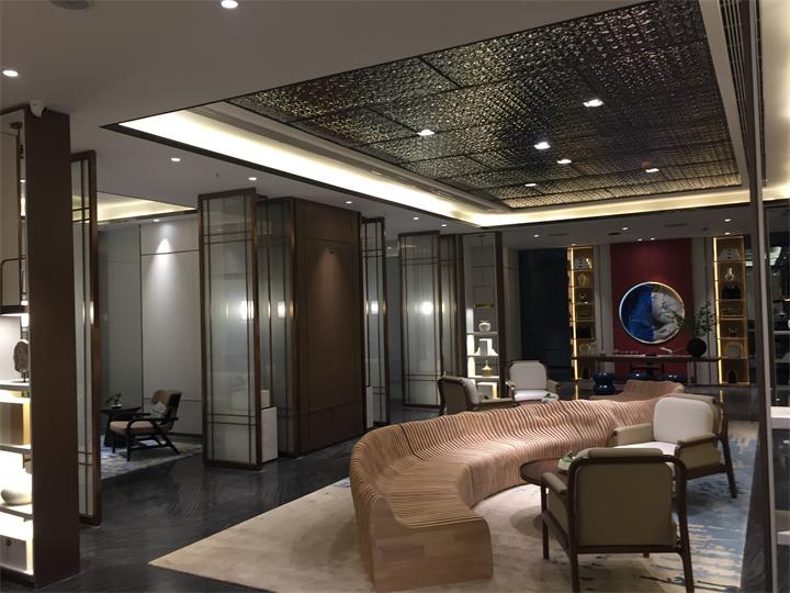 一層簽約區,不銹鋼紅古銅藝術玻璃夾絲隔斷 不銹鋼造型吊頂。